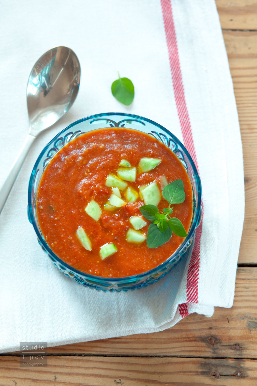 Gazpacho to taka sałatka do picia. Podawane mocno schłodzone, w szczególnie upalne dni z kilkoma kostkami lodu. Przygotowuję je na bazie kremowej emulsji, która powstaje w wyniku zmiksowania namoczonego w wodzie chleba i oliwy z oliwek. Moje gazpacho jest słodkawe i wyraziste w smaku. To za sprawą pewnej sztuczki, którą stosuję z powodzeniem od lat. Przed przygotowaniem zupy warzywa krótko piekę w wysokiej temperaturze. Dzięki temu wydobywam z nich cały ich intensywny aromat. Czy w wyniku tej modyfikacji mogę nadal nazywać mój chłodnik gazpacho? Nie wiem. Wiem natomiast, że proponuję Wam dzisiaj jedno z moich ulubionych dań. Tradycyjny dodatek posiekanych drobno ogórków, cebuli i papryki sprawia, że gazpacho zachowuje odświeżający charakter.